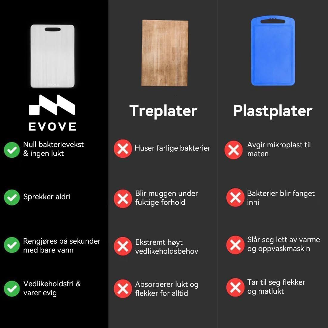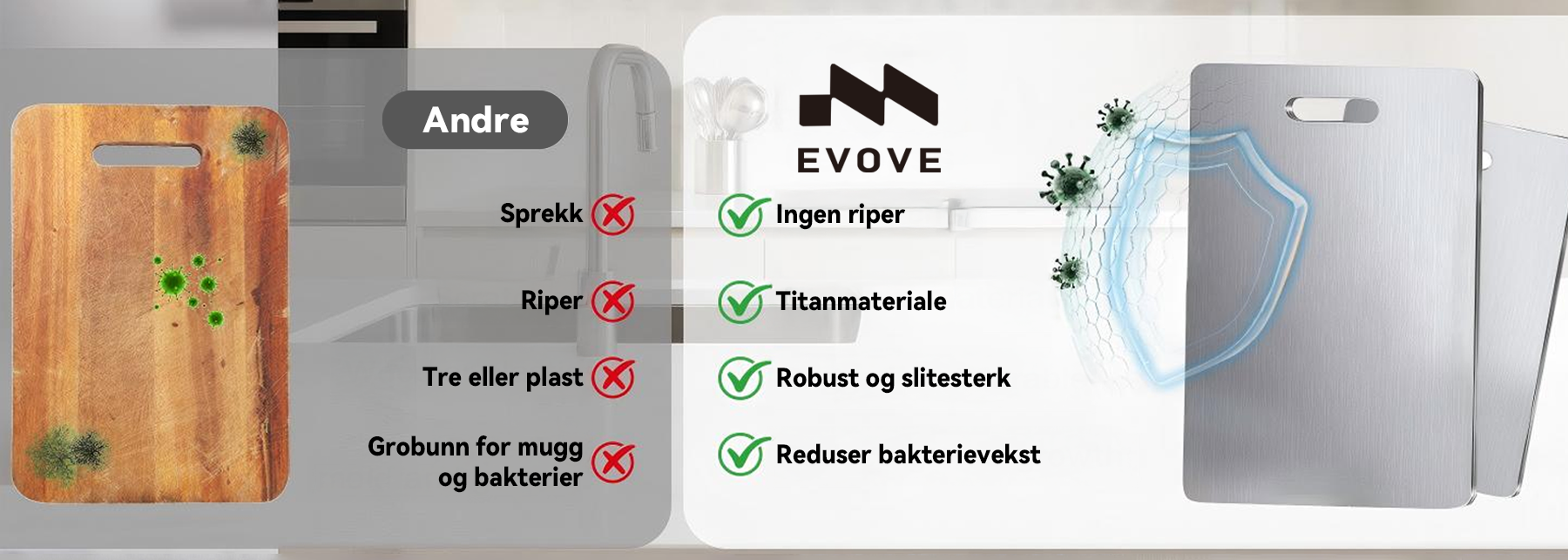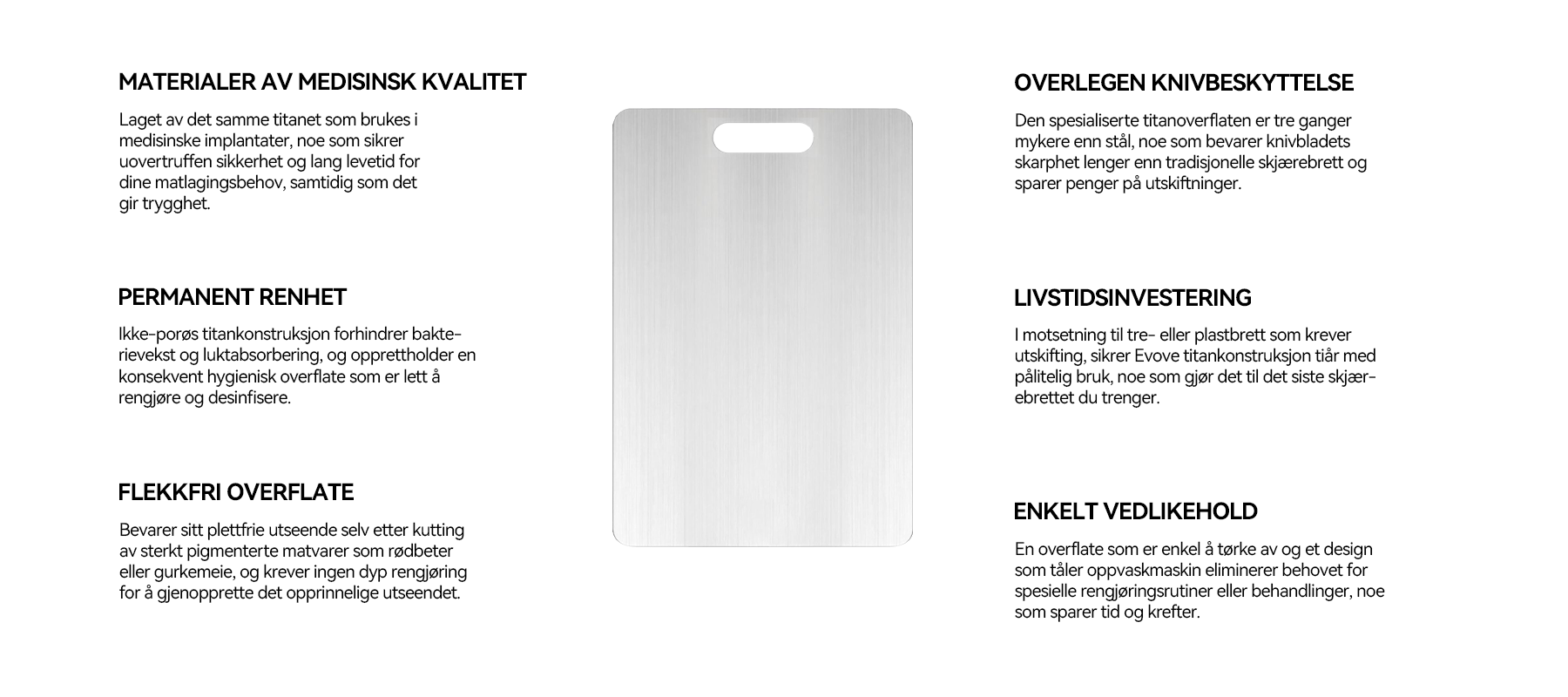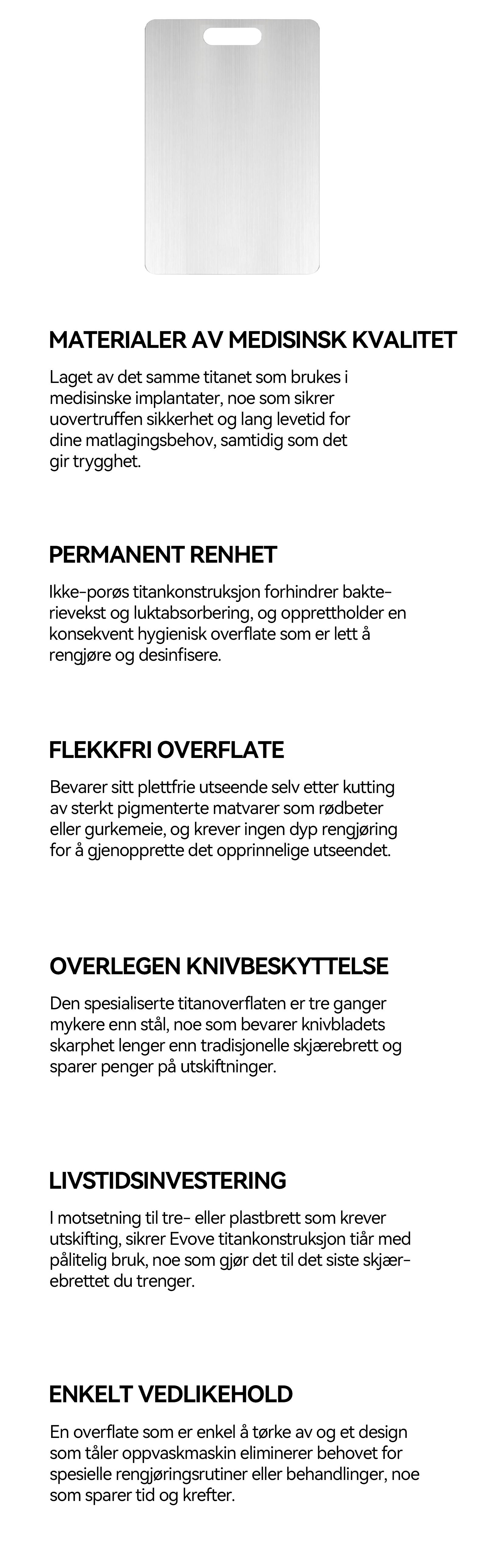 Det var slik Evove skjærebrett i titan ble til. Laget av førsteklasses titan, er det ikke-porøst, hygienisk og bygget for å vare. Den glatte overflaten gjør hvert kutt uanstrengt. Evove-løftet er enkelt: Å bringe hygiene og holdbarhet til kjøkkenet ditt, slik at du kan lage mat med selvtillit og glede.